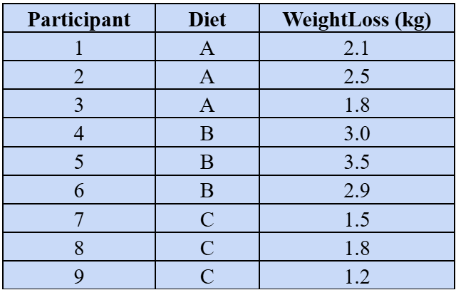 To make this journey tangible, let’s walk through a practical example. Suppose we’re interested in studying the effect of different diets on weight loss. We have three groups of participants, each following a different diet plan for a month. Our dataset looks like this: